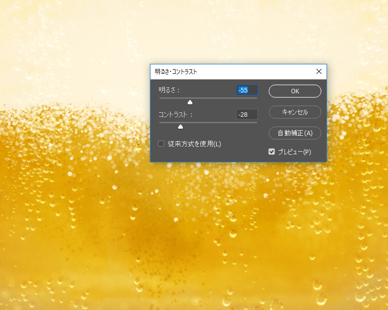 明るさ、コントラストを落とし、泡が自然に見えるようにします。